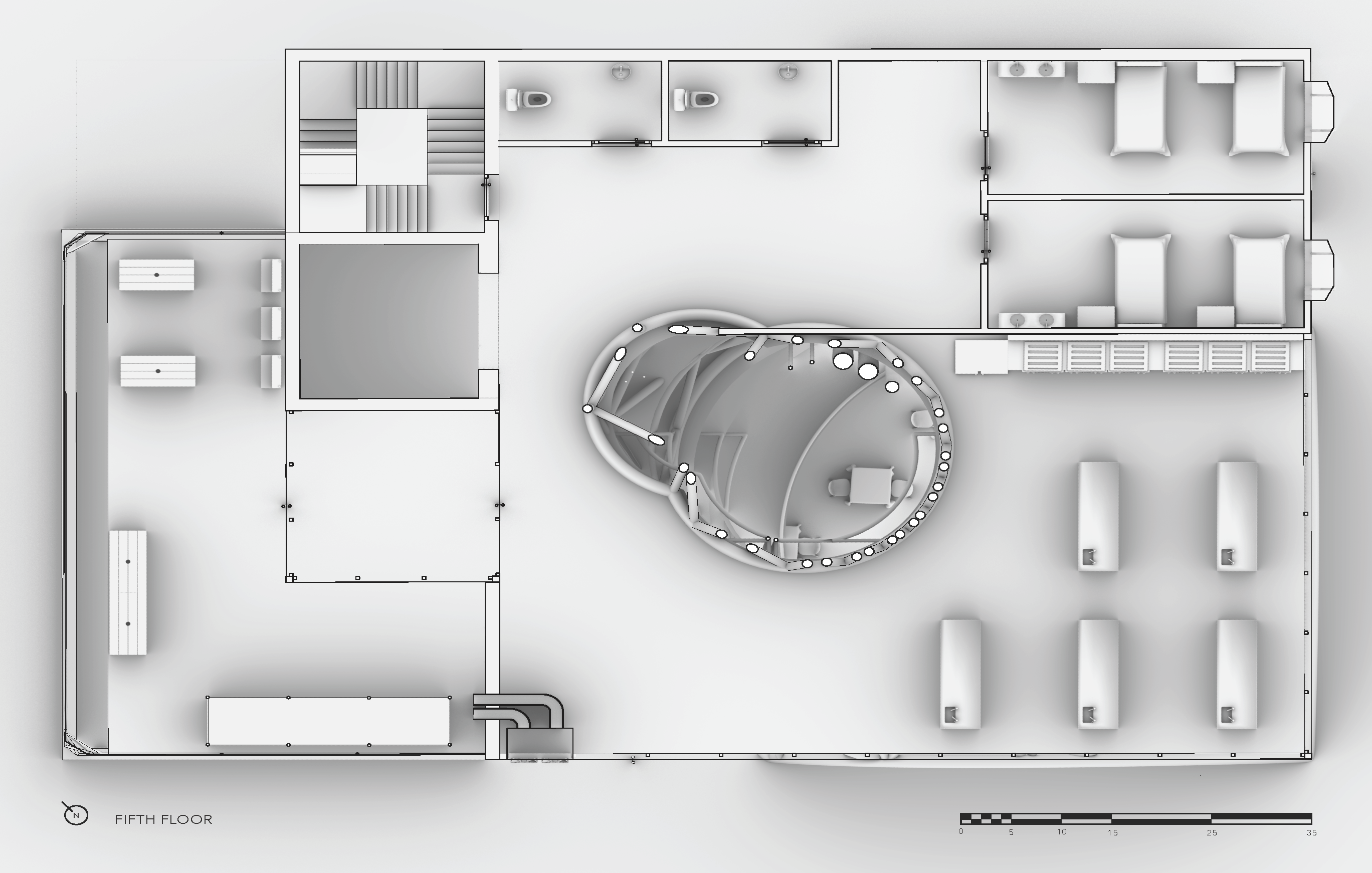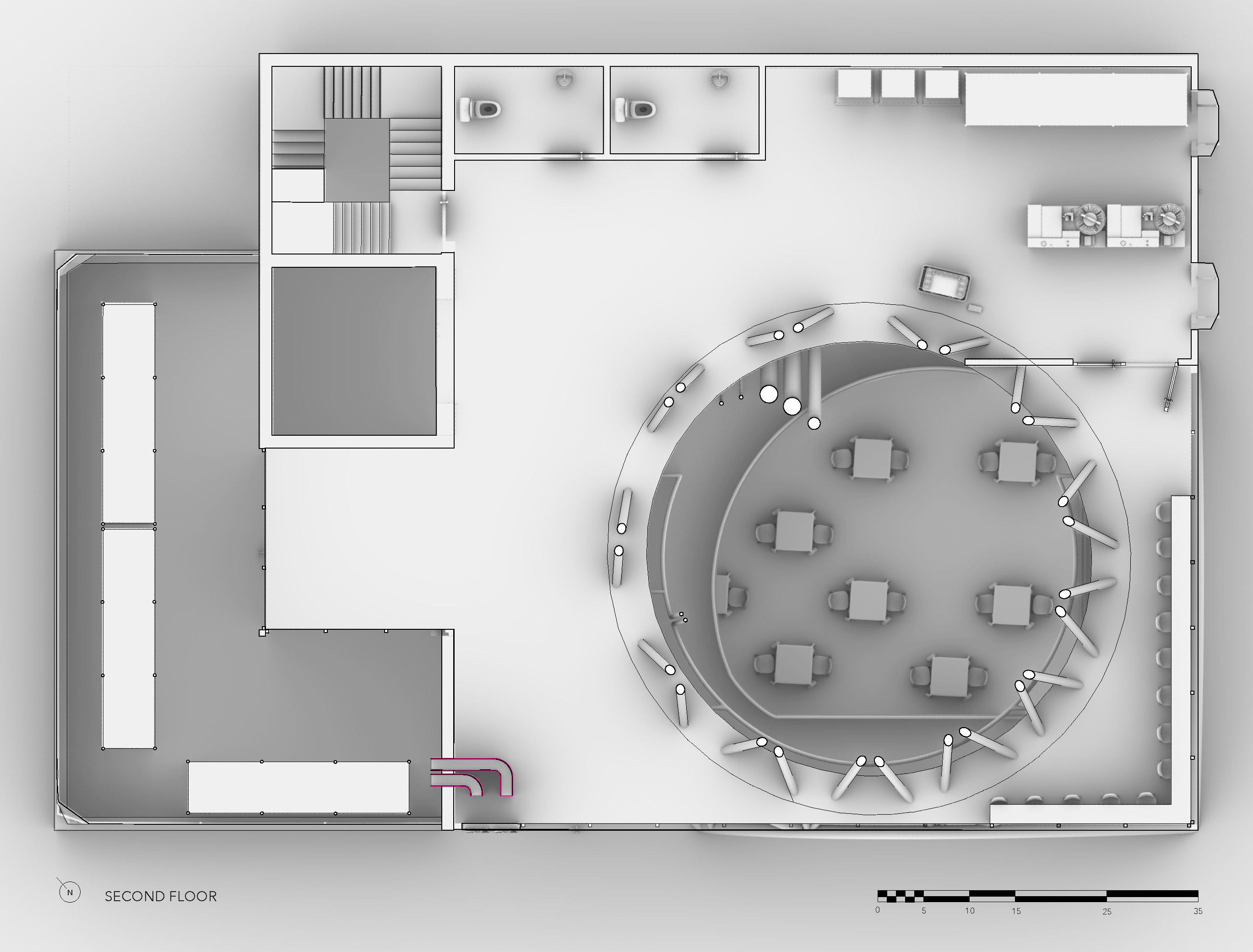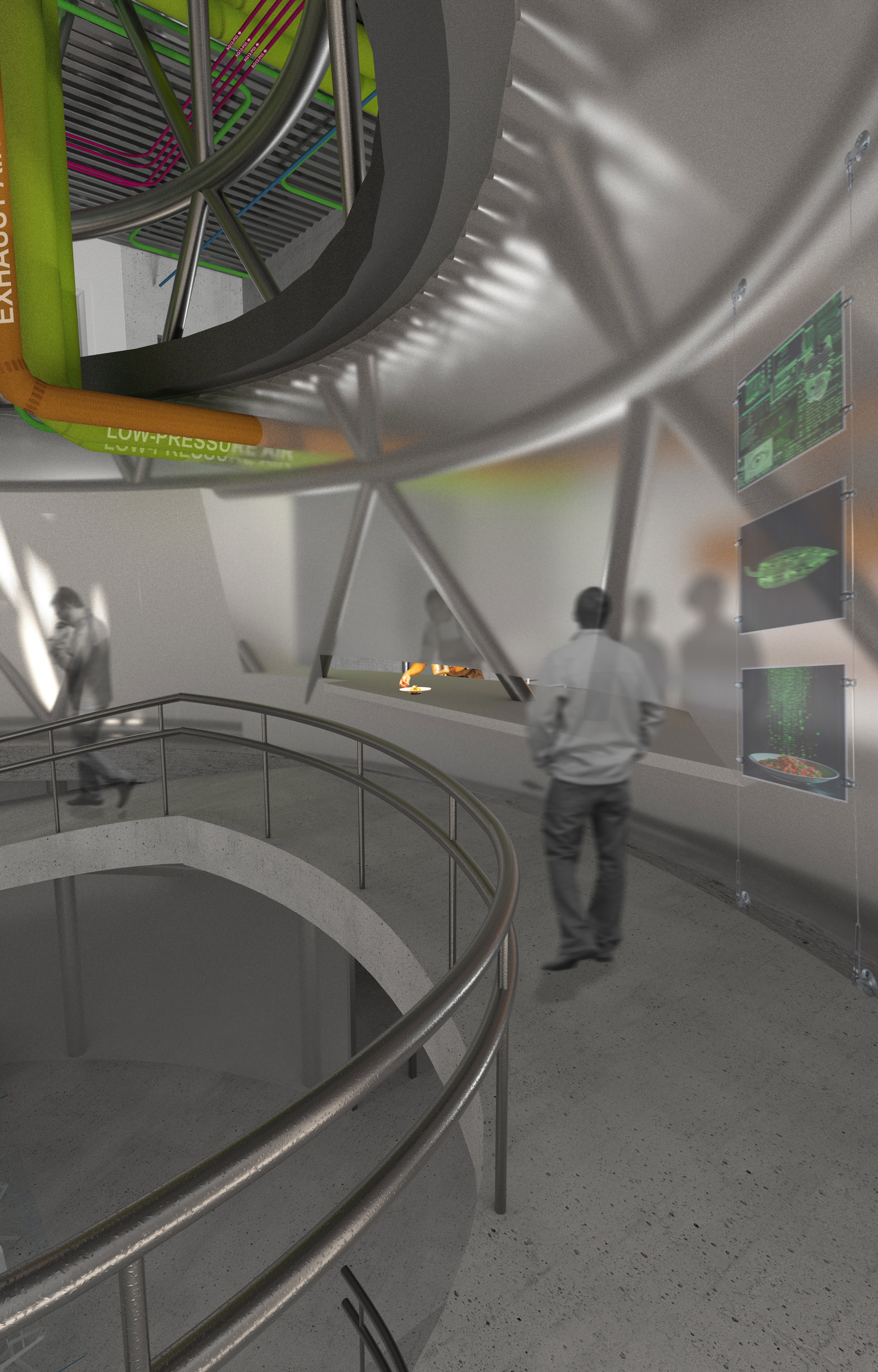 The building contains a data harvesting center where digital information is encoded into seeds, alongside a greenhouse in which these seeds are cultivated as either archival “seed records” or encoded food crops. A culinary institute (with associated student housing) supports experimentation and education, while an on-site restaurant prepares and serves encoded food - reframing content consumption as a physical, embodied experience. Below, a forum and archive allow visitors to eat these encoded foods while engaging with the seed collection, access the content they contain, and take encoded seeds with them to further distribute and preserve the data.