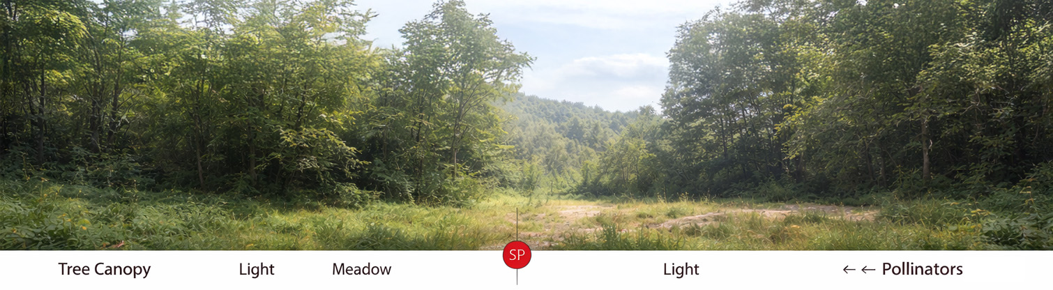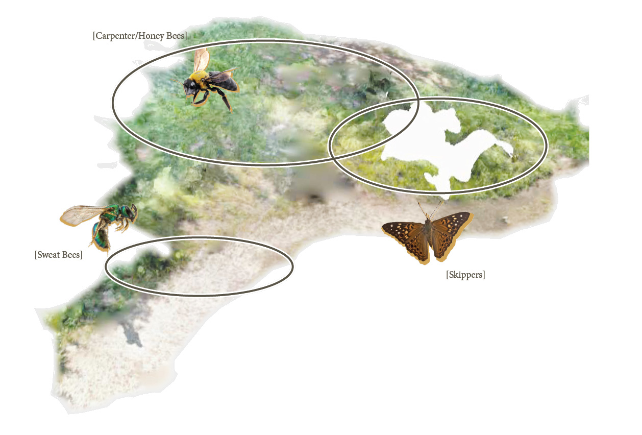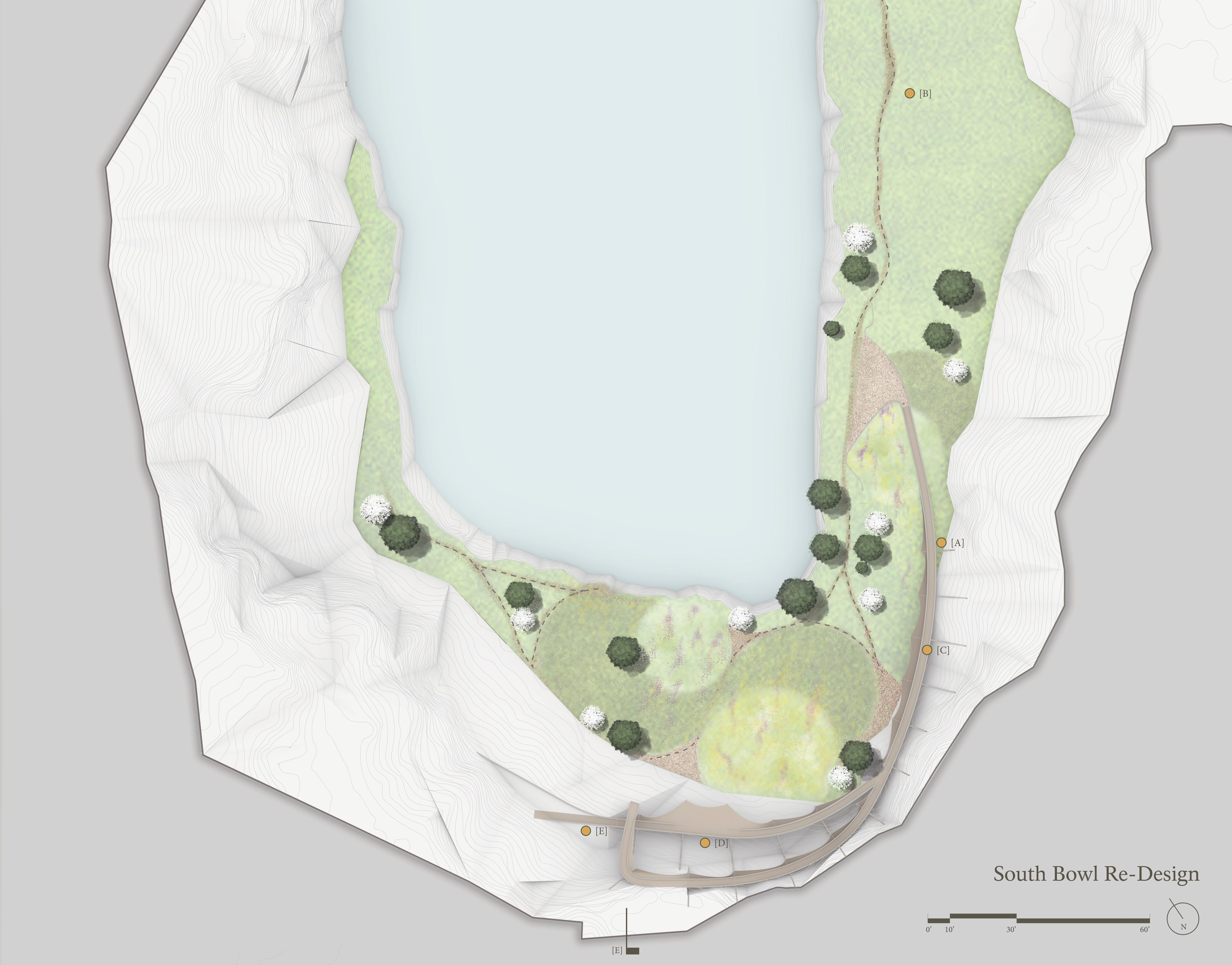 Through the study of native vegetation zones and pollinator movement patterns, areas of sensitive ecological activity were identified and prioritized for preservation. These findings informed the redesign of a key connector within the park’s trail network. To reduce human impact within critical zones while maintaining familiar circulation paths and highlighting the quarry’s distinctive viewpoints, the project proposes a tensile bridge that clings to the quarry bowl’s rock face, linking lower and upper trail systems.