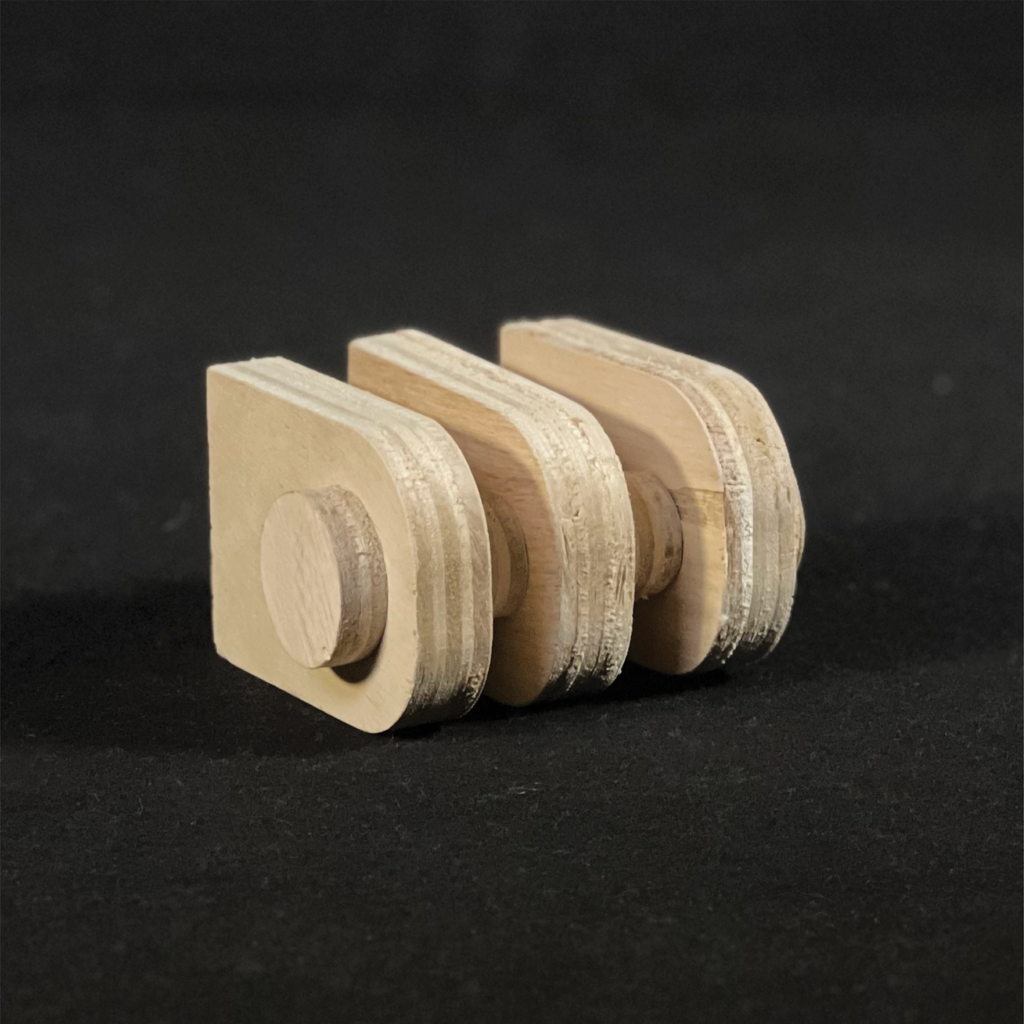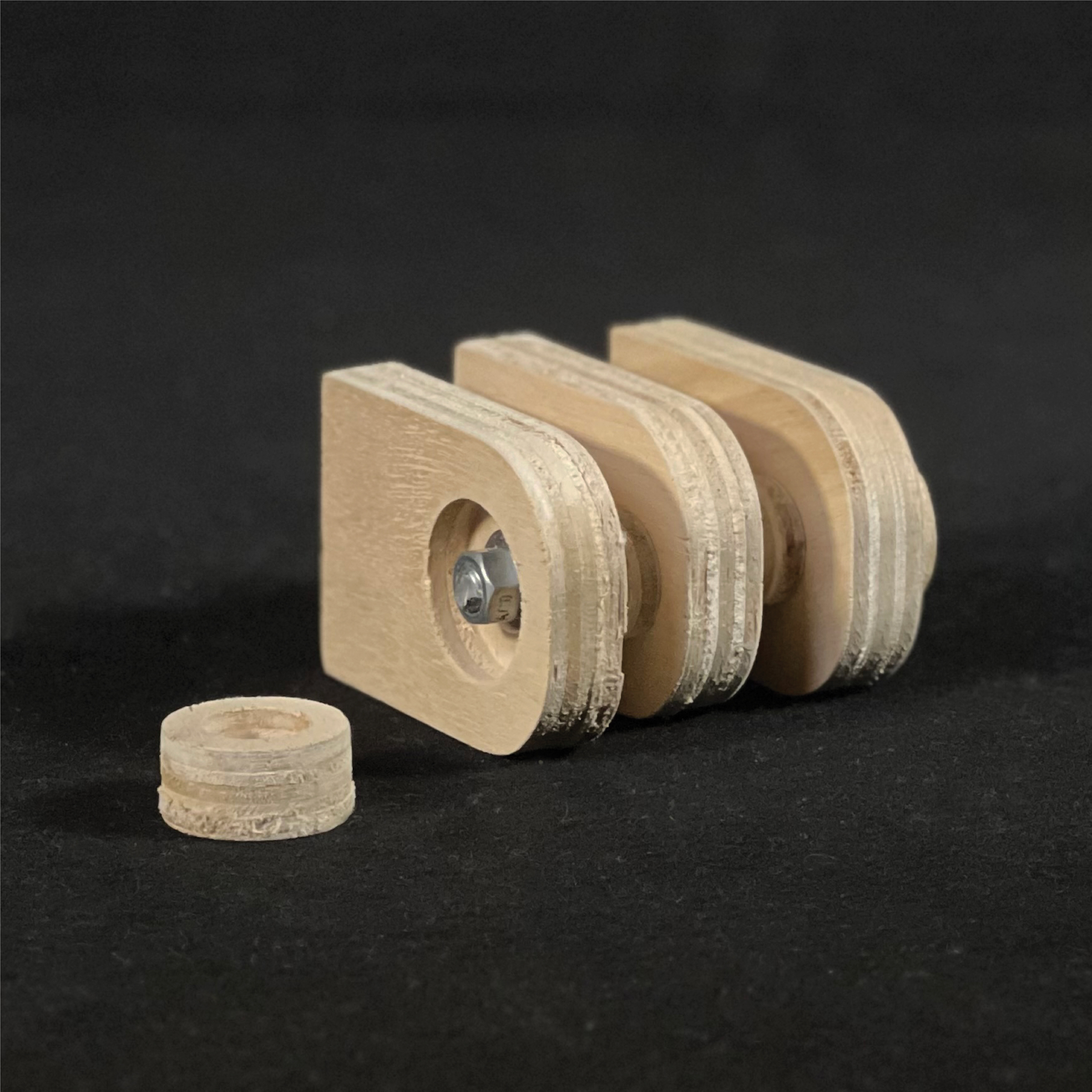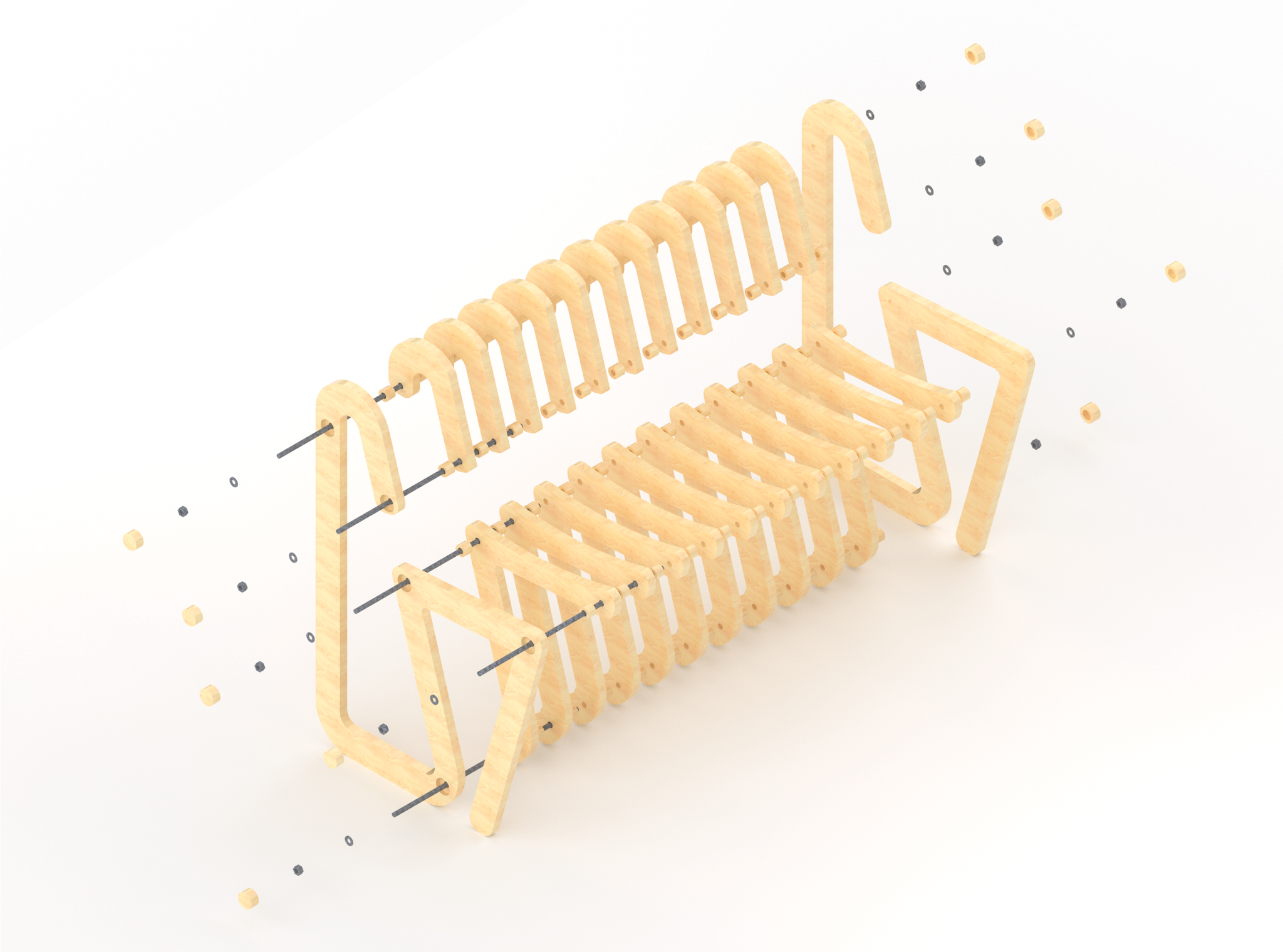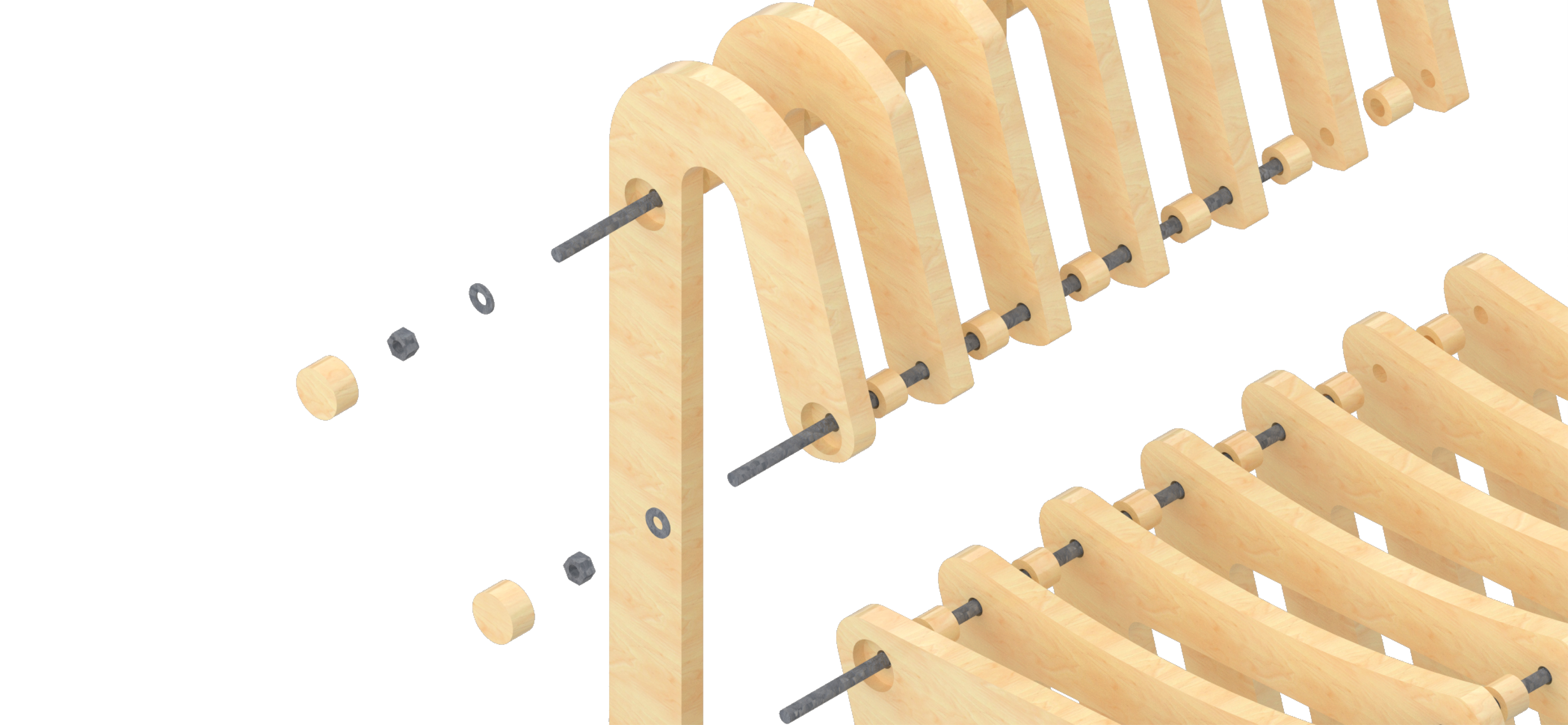 An assembly consisting of slatted wooden ribs allows for efficient interlocking layouts on the 4'x8' sheet for milling and a sturdy material configuration. This assembly system celebrates the possibilities of using standardized parts and efficient fabrication techniques. The slats are separated by spacers and secured along threaded rods. Gaps between the slats create moments of partial transparency, allowing the chair to visually recede at certain angles and sit quietly within the gallery environment. The design and fabrication process served as a platform for developing proficiency in digital tools including Rhino, the Adobe suite, and CNC milling.
